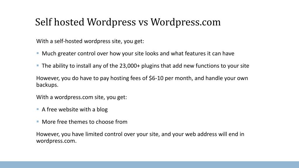 Self hosted Wordpressvs Wordpress.com With a self-hosted wordpress site, you get: Much greater control over how your site looks and what features it can have The ability to install any of the 23,000+ plugins that add new functions to your site However, you do have to pay hosting fees of $6-10 per month, and handle your own backups. With a wordpress.com site, you get: A free website with a blog More free themes to choose from However, you have limited control over your site, and your web address will end in wordpress.com.