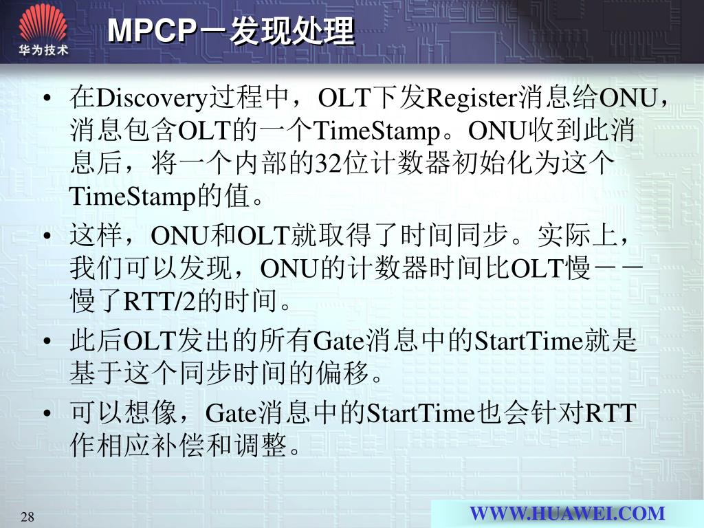 在Discovery过程中,OLT下发Register消息给ONU,消息包含OLT的一个TimeStamp。ONU收到此消息后,将一个内部的32位计数器初始化为这个TimeStamp的值。在Discovery过程中,OLT下发Register消息给ONU,消息包含OLT的一个TimeStamp。ONU收到此消息后,将一个内部的32位计数器初始化为这个TimeStamp的值。 这样,ONU和OLT就取得了时间同步。实际上,我们可以发现,ONU的计数器时间比OLT慢--慢了RTT/2的时间。 此后OLT发出的所有Gate消息中的StartTime就是基于这个同步时间的偏移。 可以想像,Gate消息中的StartTime也会针对RTT作相应补偿和调整。 MPCP-发现处理