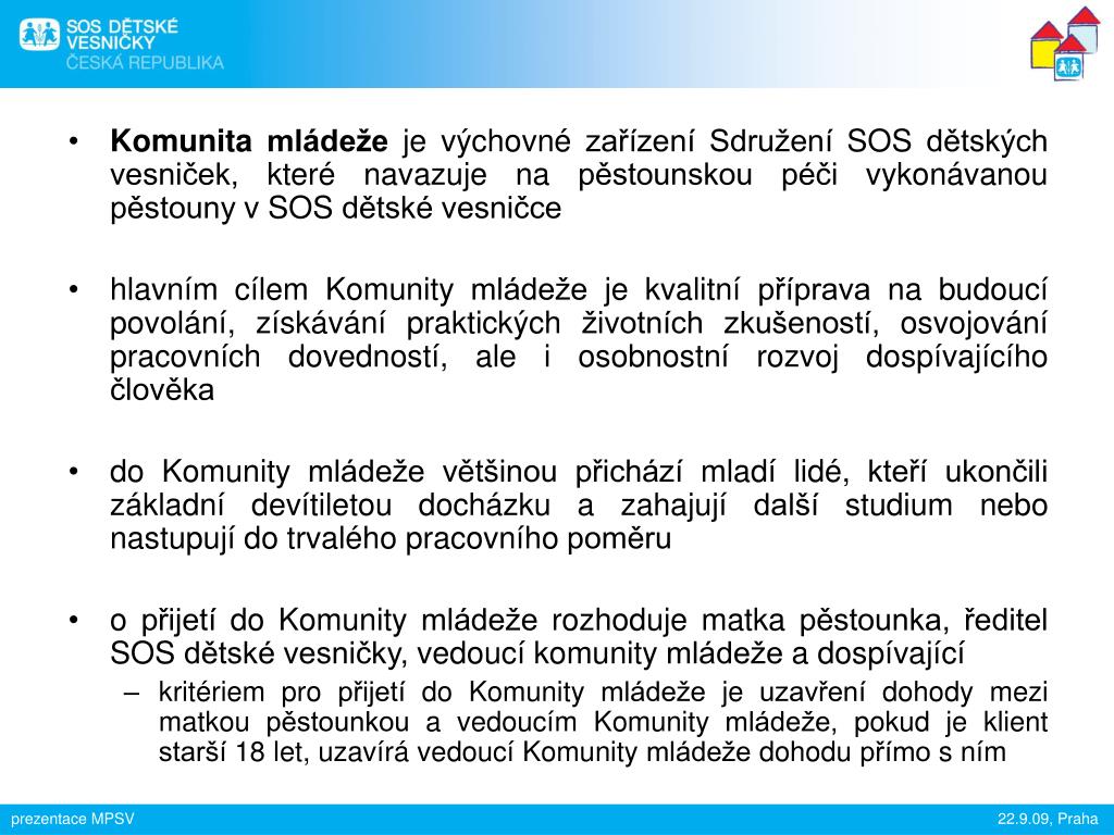 Komunita mládeže je výchovné zařízení Sdružení SOS dětských vesniček, které navazuje na pěstounskou péči vykonávanou pěstouny v SOS dětské vesničce • hlavním cílem Komunity mládeže je kvalitní příprava na budoucí povolání, získávání praktických životních zkušeností, osvojování pracovních dovedností, ale i osobnostní rozvoj dospívajícího člověka • do Komunity mládeže většinou přichází mladí lidé, kteří ukončili základní devítiletou docházku a zahajují další studium nebo nastupují do trvalého pracovního poměru • o přijetí do Komunity mládeže rozhoduje matka pěstounka, ředitel SOS dětské vesničky, vedoucí komunity mládeže a dospívající • kritériem pro přijetí do Komunity mládeže je uzavření dohody mezi matkou pěstounkou a vedoucím Komunity mládeže, pokud je klient starší 18 let, uzavírá vedoucí Komunity mládeže dohodu přímo s ním