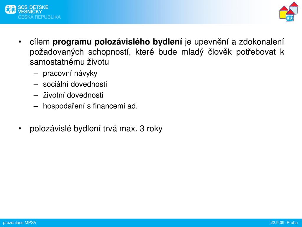 cílem programu polozávislého bydlení je upevnění a zdokonalení požadovaných schopností, které bude mladý člověk potřebovat k samostatnému životu • pracovní návyky • sociální dovednosti • životní dovednosti • hospodaření s financemi ad. • polozávislé bydlení trvá max. 3 roky