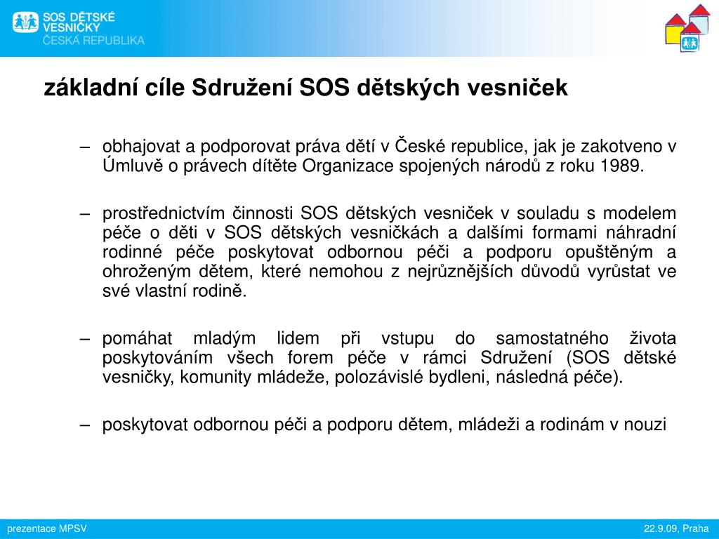 základní cíle Sdružení SOS dětských vesniček • obhajovat a podporovat práva dětí v České republice, jak je zakotveno v Úmluvě o právech dítěte Organizace spojených národů z roku 1989. • prostřednictvím činnosti SOS dětských vesniček v souladu s modelem péče o děti v SOS dětských vesničkách a dalšími formami náhradní rodinné péče poskytovat odbornou péči a podporu opuštěným a ohroženým dětem, které nemohou z nejrůznějších důvodů vyrůstat ve své vlastní rodině. • pomáhat mladým lidem při vstupu do samostatného života poskytováním všech forem péče v rámci Sdružení (SOS dětské vesničky, komunity mládeže, polozávislé bydleni, následná péče). • poskytovat odbornou péči a podporu dětem, mládeži a rodinám v nouzi