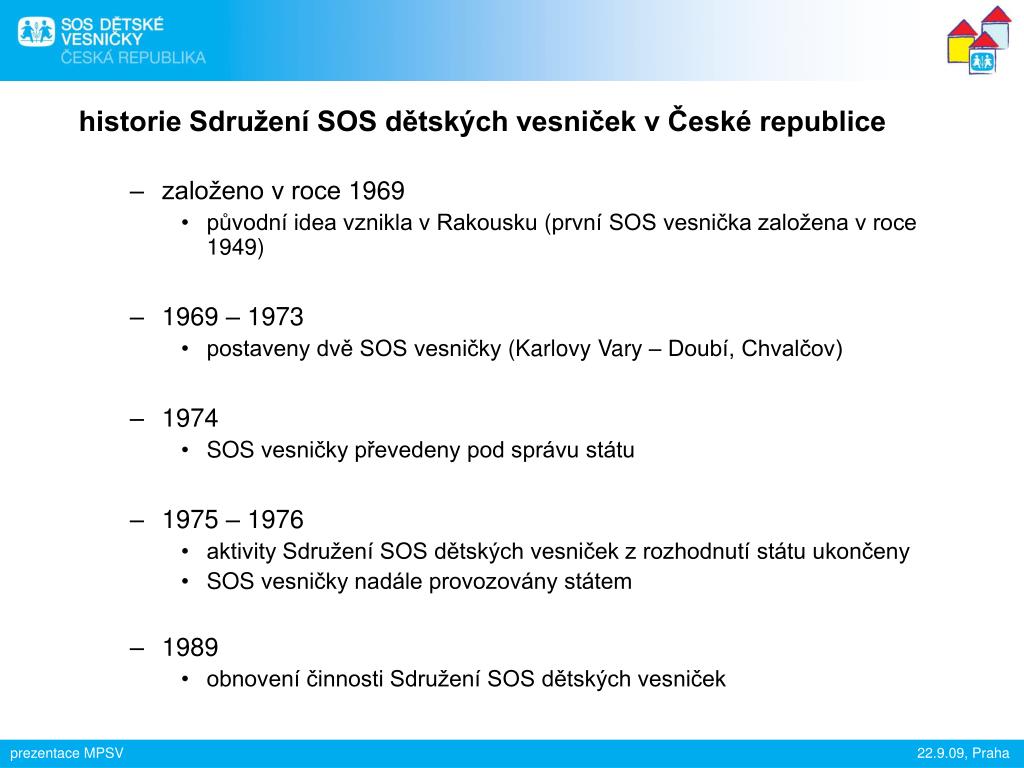 historie Sdružení SOS dětských vesniček v České republice založeno v roce 1969 původní idea vznikla v Rakousku (první SOS vesnička založena v roce 1949) 1969 – 1973 postaveny dvě SOS vesničky(Karlovy Vary – Doubí, Chvalčov) 1974 SOS vesničky převedeny pod správu státu 1975 – 1976 aktivity Sdružení SOS dětských vesniček z rozhodnutí státu ukončeny SOS vesničky nadále provozovány státem 1989 obnovení činnosti Sdružení SOS dětských vesniček