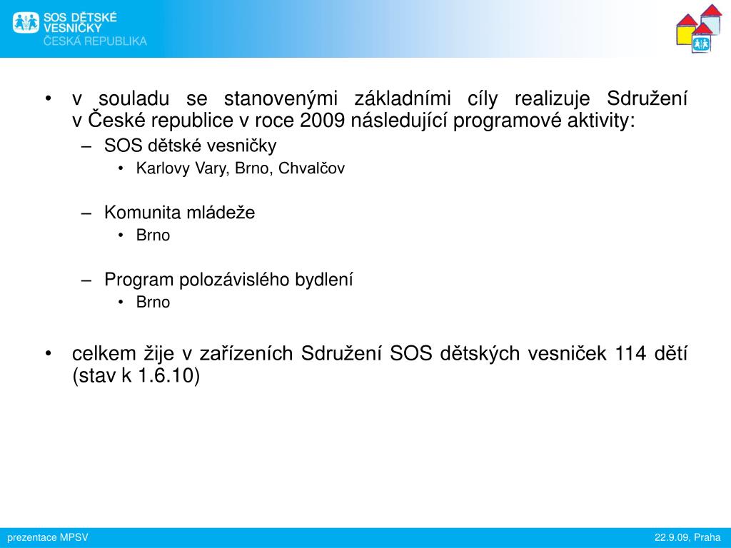 v souladu se stanovenými základními cíly realizuje Sdružení v České republice v roce 2009 následující programové aktivity: • SOS dětské vesničky • Karlovy Vary, Brno, Chvalčov • Komunita mládeže • Brno • Program polozávislého bydlení • Brno • celkem žije v zařízeních Sdružení SOS dětských vesniček 114 dětí (stav k 1.6.10)