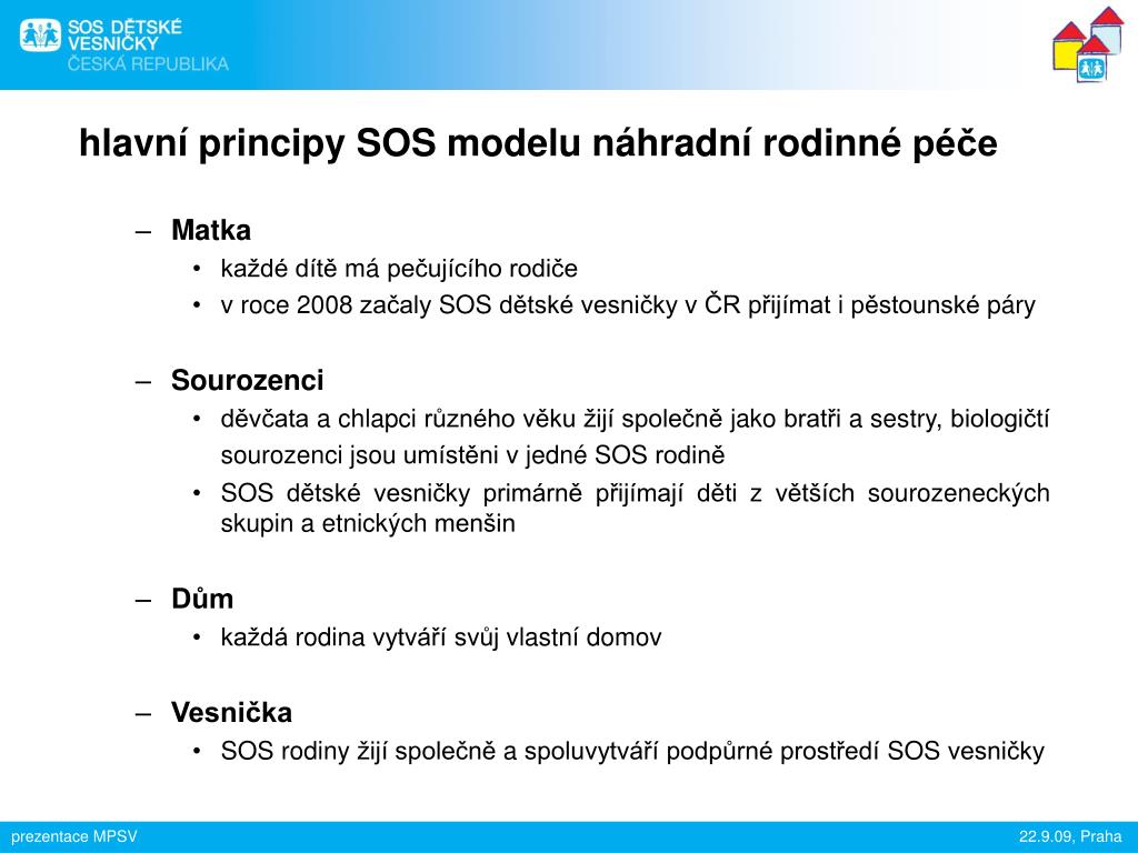 hlavní principy SOS modelu náhradní rodinné péče • Matka • každé dítě má pečujícího rodiče • v roce 2008 začaly SOS dětské vesničky v ČR přijímat i pěstounské páry • Sourozenci • děvčata a chlapci různého věku žijí společně jako bratři a sestry, biologičtí sourozenci jsou umístěni v jedné SOS rodině • SOS dětské vesničky primárně přijímají děti z větších sourozeneckých skupin a etnických menšin • Dům • každá rodina vytváří svůj vlastní domov • Vesnička • SOS rodiny žijí společně a spoluvytváří podpůrné prostředí SOS vesničky