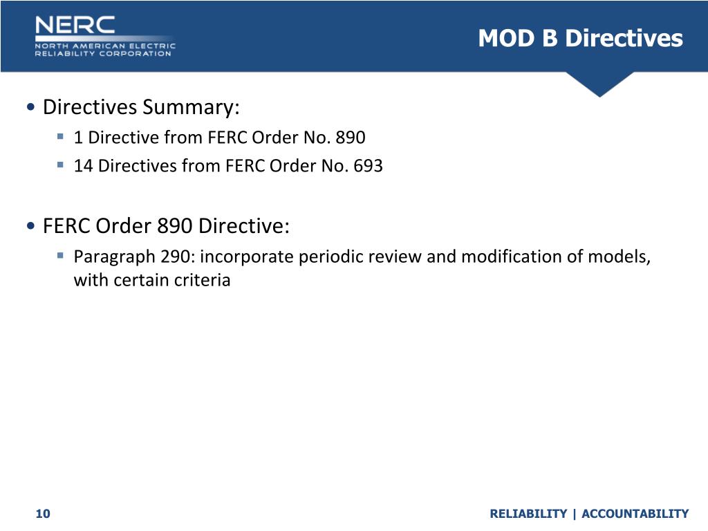 MOD B Directives • Directives Summary: • 1 Directive from FERC Order No. 890 • 14 Directives from FERC Order No. 693 • FERC Order 890 Directive: • Paragraph 290: incorporate periodic review and modification of models, with certain criteria