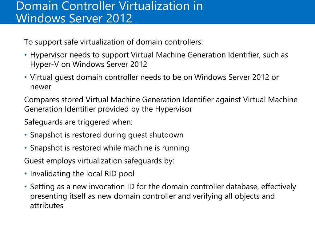 Domain Controller Virtualization in Windows Server 2012 • To support safe virtualization of domain controllers: • Hypervisor needs to support Virtual Machine Generation Identifier, such as Hyper-V on Windows Server 2012 • Virtual guest domain controller needs to be on Windows Server 2012 or newer • Compares stored Virtual Machine Generation Identifieragainst Virtual Machine Generation Identifierprovided by the Hypervisor • Safeguards are triggered when: • Snapshot is restored during guest shutdown • Snapshot is restored while machine is running • Guest employs virtualization safeguards by: • Invalidating the local RID pool • Setting as a new invocation ID for the domain controller database, effectively presenting itself as new domain controller and verifying all objects and attributes
