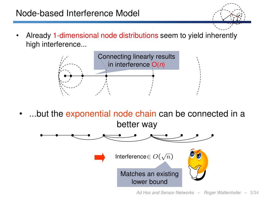 Interference Node-based Interference Model • Already 1-dimensional node distributions seem to yield inherently high interference... Connecting linearly results in interference O(n) • ...but the exponential node chain can be connected in a better way Matches an existing lower bound
