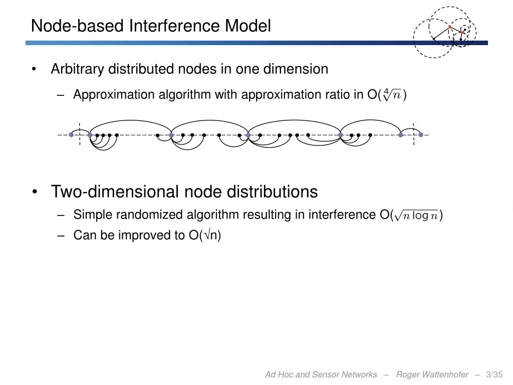 Node-based Interference Model • Arbitrary distributed nodes in one dimension • Approximation algorithm with approximation ratio in O( ) • Two-dimensional node distributions • Simple randomized algorithm resulting in interference O( ) • Can be improved to O(√n)