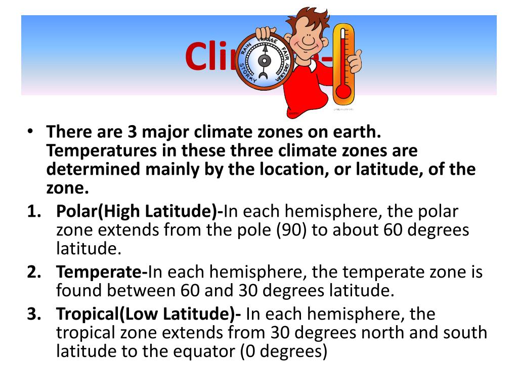 Climate- There are 3 major climate zones on earth. Temperatures in these three climate zones are determined mainly by the location, or latitude, of the zone. Polar(High Latitude)-In each hemisphere, the polar zone extends from the pole (90) to about 60 degrees latitude. Temperate-In each hemisphere, the temperate zone is found between 60 and 30 degrees latitude. Tropical(Low Latitude)- In each hemisphere, the tropical zone extends from 30 degrees north and south latitude to the equator (0 degrees)