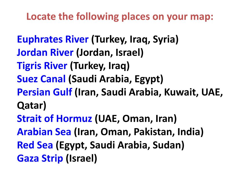 Locate the following places on your map: Euphrates River (Turkey, Iraq, Syria) Jordan River (Jordan, Israel) Tigris River (Turkey, Iraq) Suez Canal (Saudi Arabia, Egypt) Persian Gulf (Iran, Saudi Arabia, Kuwait, UAE, Qatar) Strait of Hormuz (UAE, Oman, Iran) Arabian Sea (Iran, Oman, Pakistan, India) Red Sea (Egypt, Saudi Arabia, Sudan) Gaza Strip (Israel)