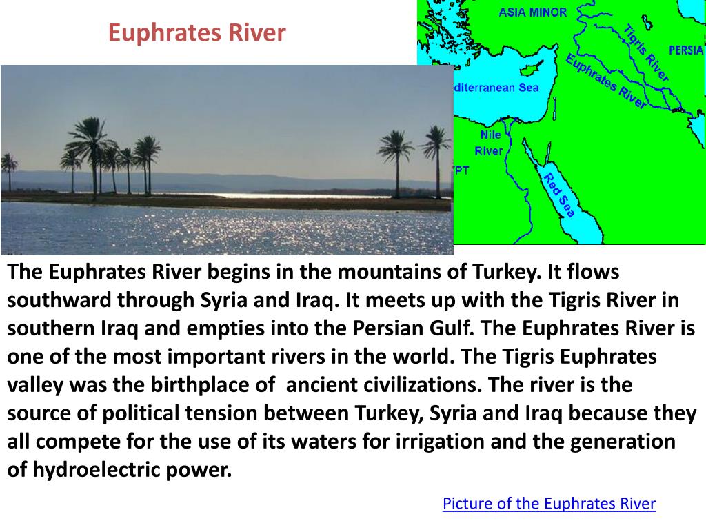 Euphrates River The Euphrates River begins in the mountains of Turkey. It flows southward through Syria and Iraq. It meets up with the Tigris River in southern Iraq and empties into the Persian Gulf. The Euphrates River is one of the most important rivers in the world. The Tigris Euphrates valley was the birthplace of ancient civilizations. The river is the source of political tension between Turkey, Syria and Iraq because they all compete for the use of its waters for irrigation and the generation of hydroelectric power. Picture of the Euphrates River