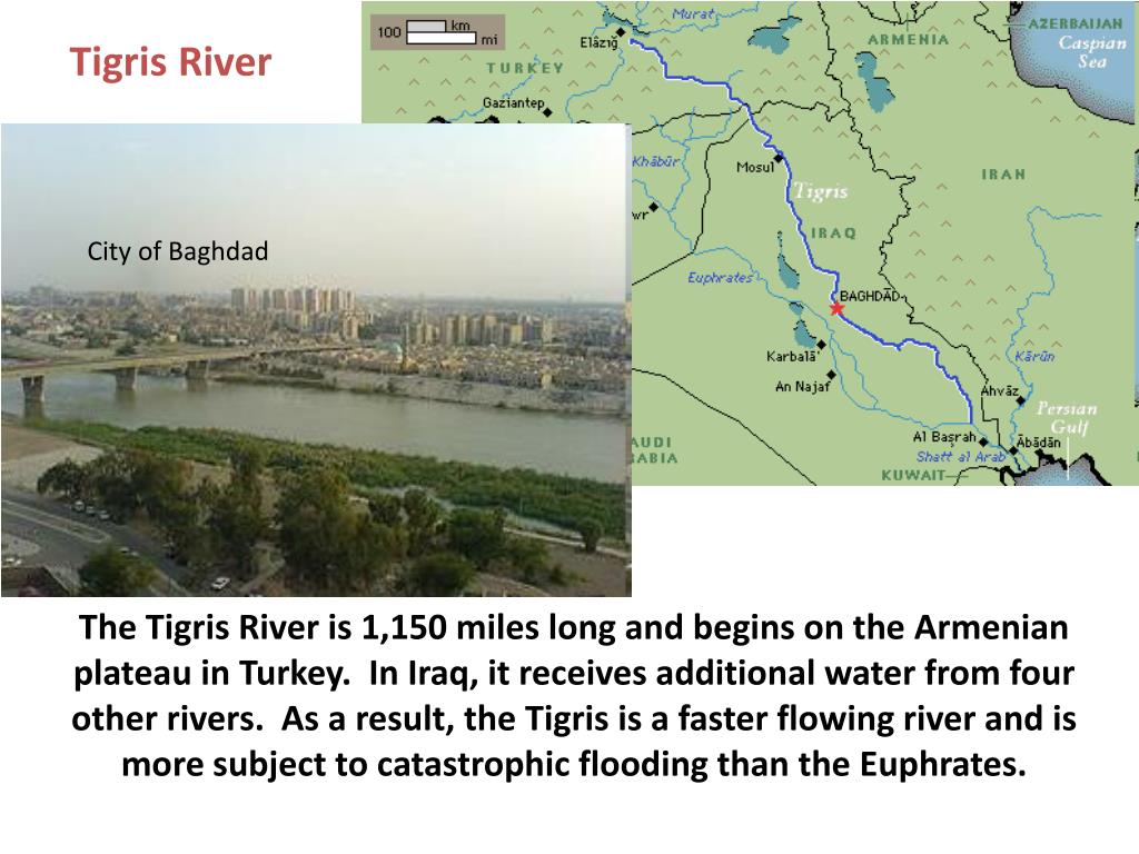 Tigris River City of Baghdad The Tigris River is 1,150 miles long and begins on the Armenian plateau in Turkey. In Iraq, it receives additional water from four other rivers. As a result, the Tigris is a faster flowing river and is more subject to catastrophic flooding than the Euphrates.