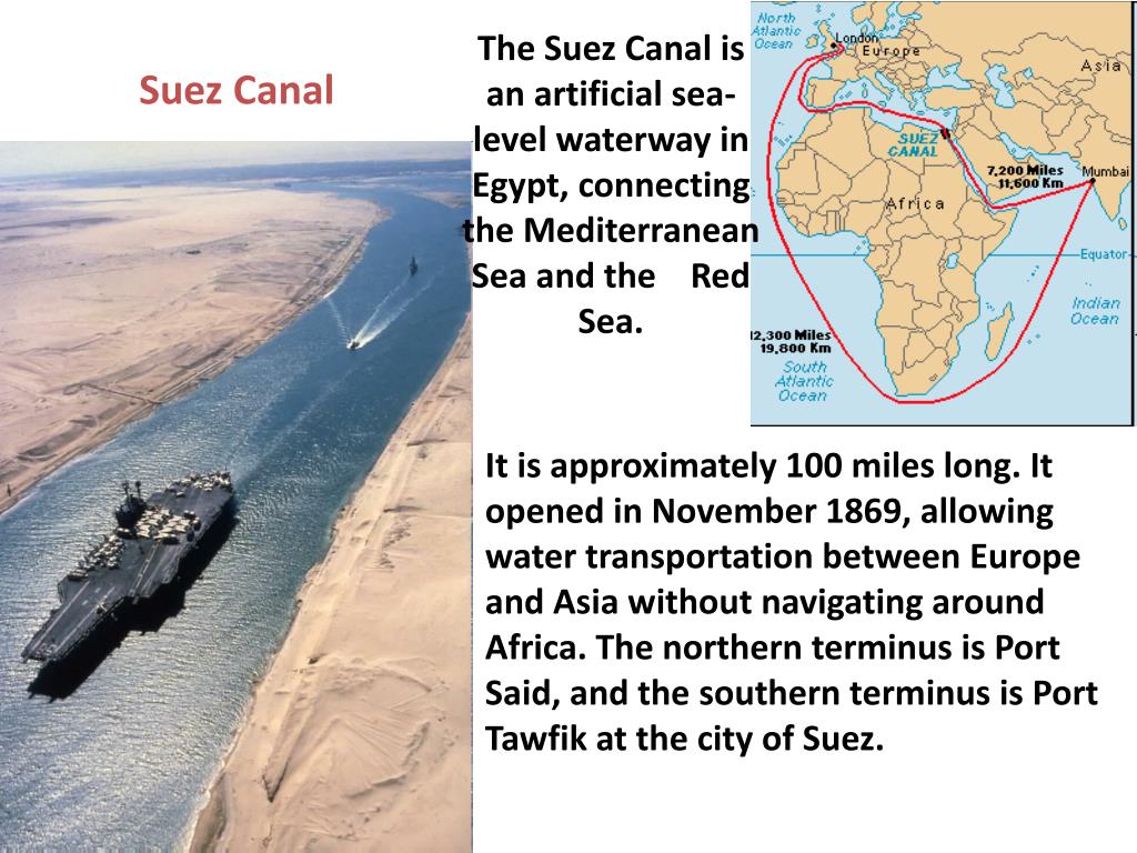 The Suez Canal is an artificial sea-level waterway in Egypt, connecting the Mediterranean Sea and the Red Sea. Suez Canal It is approximately 100 miles long. It opened in November 1869, allowing water transportation between Europe and Asia without navigating around Africa. The northern terminus is Port Said, and the southern terminus is Port Tawfik at the city of Suez.