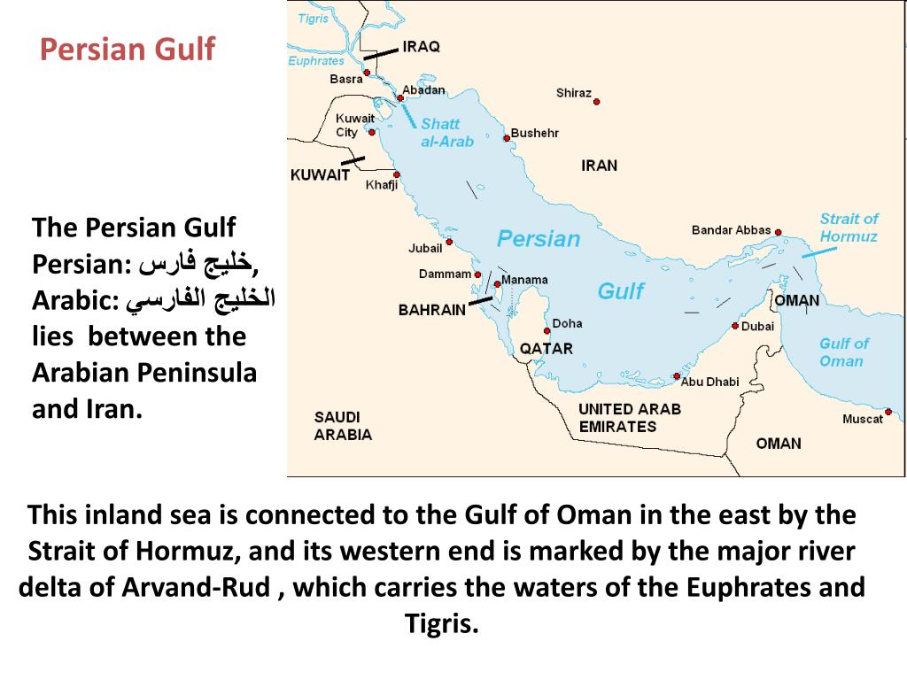 Persian Gulf The Persian Gulf Persian: خلیج فارس, Arabic: الخليج الفارسي lies between the Arabian Peninsula and Iran. This inland sea is connected to the Gulf of Oman in the east by the Strait of Hormuz, and its western end is marked by the major river delta of Arvand-Rud , which carries the waters of the Euphrates and Tigris.