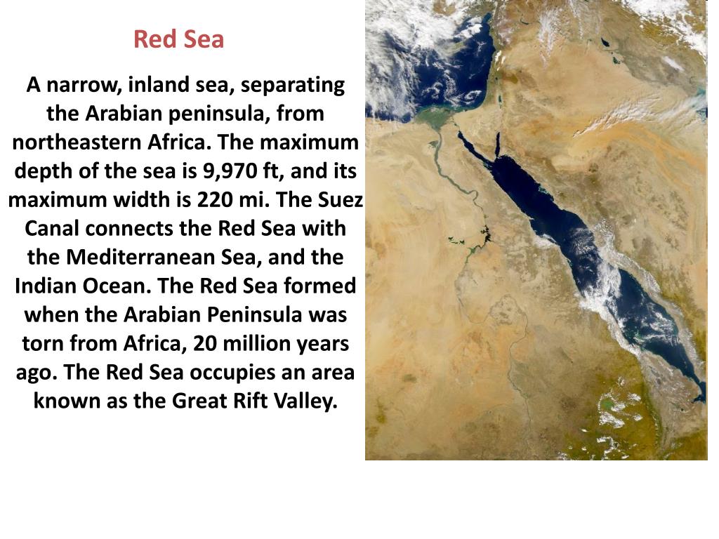 Red Sea A narrow, inland sea, separating the Arabian peninsula, from northeastern Africa. The maximum depth of the sea is 9,970 ft, and its maximum width is 220 mi. The Suez Canal connects the Red Sea with the Mediterranean Sea, and the Indian Ocean. The Red Sea formed when the Arabian Peninsula was torn from Africa, 20 million years ago. The Red Sea occupies an area known as the Great Rift Valley.