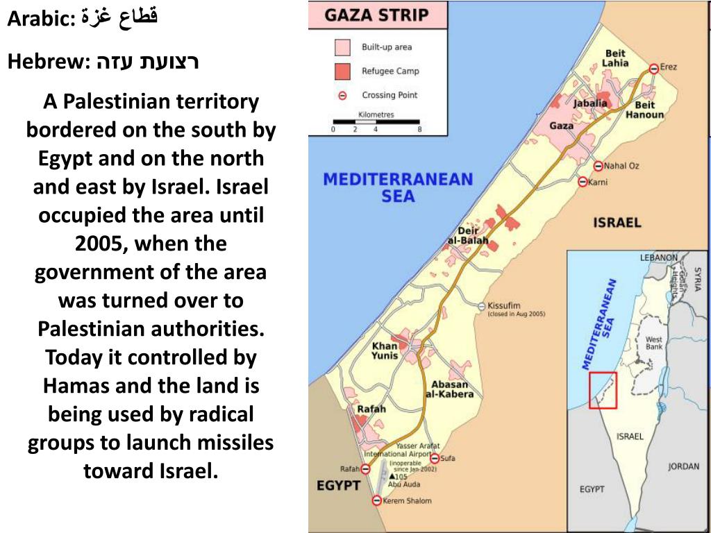 Arabic: قطاع غزة Hebrew: רצועת עזה A Palestinian territory bordered on the south by Egypt and on the north and east by Israel. Israel occupied the area until 2005, when the government of the area was turned over to Palestinian authorities. Today it controlled by Hamas and the land is being used by radical groups to launch missiles toward Israel.