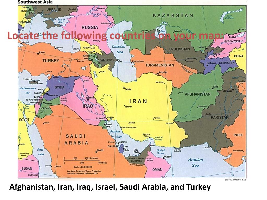Locate the following countries on your map: Afghanistan, Iran, Iraq, Israel, Saudi Arabia, and Turkey