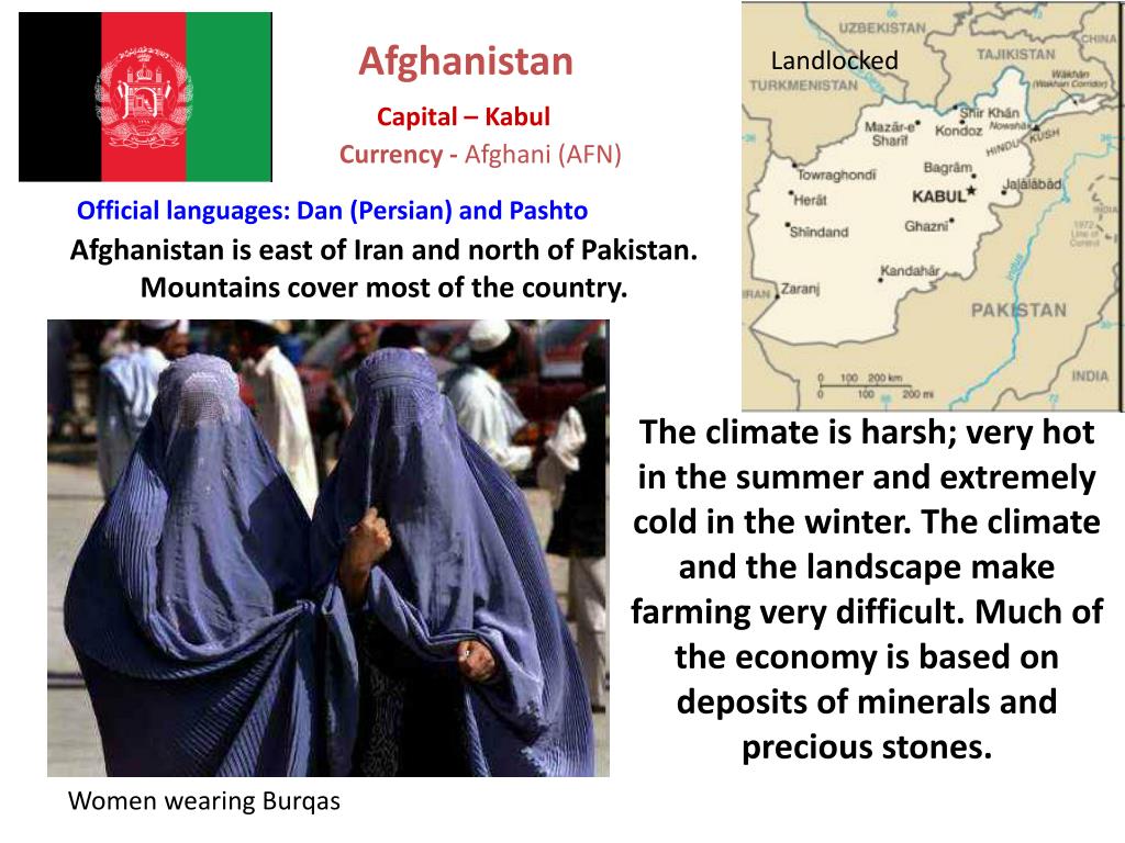 Afghanistan Landlocked Capital – Kabul Currency - Afghani (AFN) Official languages: Dan (Persian) and Pashto Afghanistan is east of Iran and north of Pakistan. Mountains cover most of the country. The climate is harsh; very hot in the summer and extremely cold in the winter. The climate and the landscape make farming very difficult. Much of the economy is based on deposits of minerals and precious stones. Women wearing Burqas