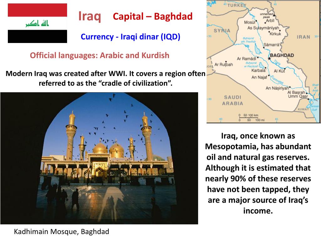 Iraq Capital – Baghdad Currency - Iraqi dinar (IQD) Official languages: Arabic and Kurdish Modern Iraq was created after WWI. It covers a region often referred to as the “cradle of civilization”. Iraq, once known as Mesopotamia, has abundant oil and natural gas reserves. Although it is estimated that nearly 90% of these reserves have not been tapped, they are a major source of Iraq’s income. Kadhimain Mosque, Baghdad