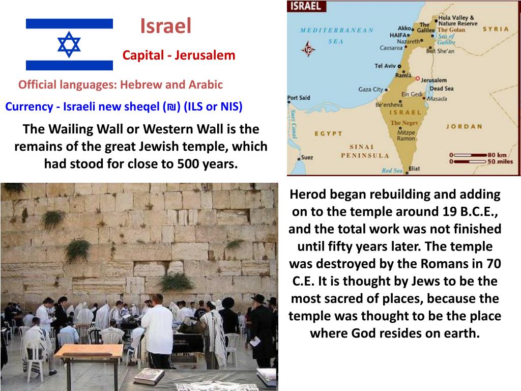 Israel Capital - Jerusalem Official languages: Hebrew and Arabic Currency - Israeli new sheqel (₪) (ILS or NIS) The Wailing Wall or Western Wall is the remains of the great Jewish temple, which had stood for close to 500 years. Herod began rebuilding and adding on to the temple around 19 B.C.E., and the total work was not finished until fifty years later. The temple was destroyed by the Romans in 70 C.E. It is thought by Jews to be the most sacred of places, because the temple was thought to be the place where God resides on earth.