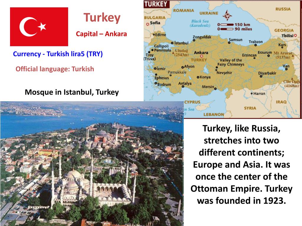 Turkey Capital – Ankara Currency - Turkish lira5 (TRY) Official language: Turkish Mosque in Istanbul, Turkey Turkey, like Russia, stretches into two different continents; Europe and Asia. It was once the center of the Ottoman Empire. Turkey was founded in 1923.