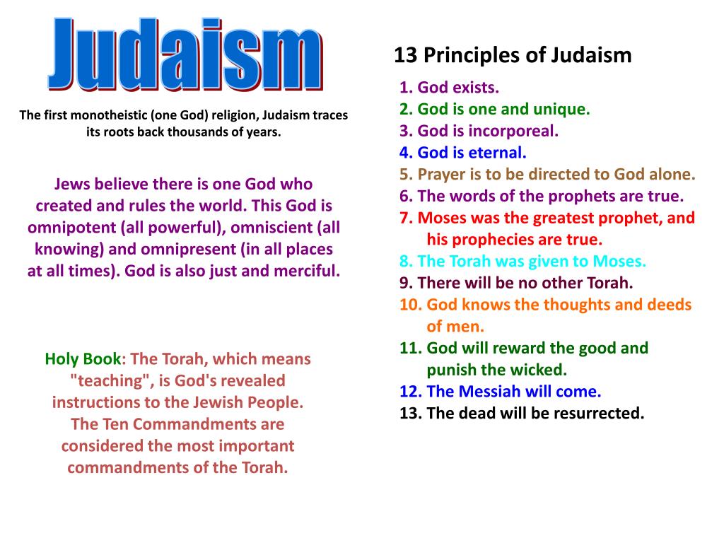 Judaism 13Principles of Judaism 1. God exists. 2. God is one and unique. 3. God is incorporeal. 4. God is eternal. 5. Prayer is to be directed to God alone. 6. The words of the prophets are true. 7. Moses was the greatest prophet, and his prophecies are true. 8. The Torah was given to Moses. 9. There will be no other Torah. 10. God knows the thoughts and deeds of men. 11. God will reward the good and punish the wicked. 12. The Messiah will come. 13. The dead will be resurrected. The first monotheistic (one God) religion, Judaism traces its roots back thousands of years. Jews believe there is one God who created and rules the world. This God is omnipotent (all powerful), omniscient (all knowing) and omnipresent (in all places at all times). God is also just and merciful. Holy Book: The Torah, which means "teaching", is God's revealed instructions to the Jewish People. The Ten Commandments are considered the most important commandments of the Torah.
