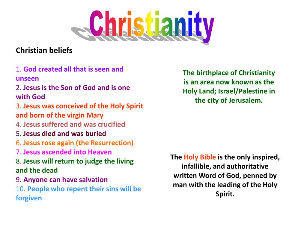 Christianity Christian beliefs 1. God created all that is seen and unseen2. Jesus is the Son of God and is one with God3. Jesus was conceived of the Holy Spirit and born of the virgin Mary4. Jesus suffered and was crucified5. Jesus died and was buried6. Jesus rose again (the Resurrection)7. Jesus ascended into Heaven8. Jesus will return to judge the living and the dead 9. Anyone can have salvation10. People who repent their sins will be forgiven The birthplace of Christianity is an area now known as the Holy Land; Israel/Palestine in the city of Jerusalem. The Holy Bible is the only inspired, infallible, and authoritative written Word of God, penned by man with the leading of the Holy Spirit.