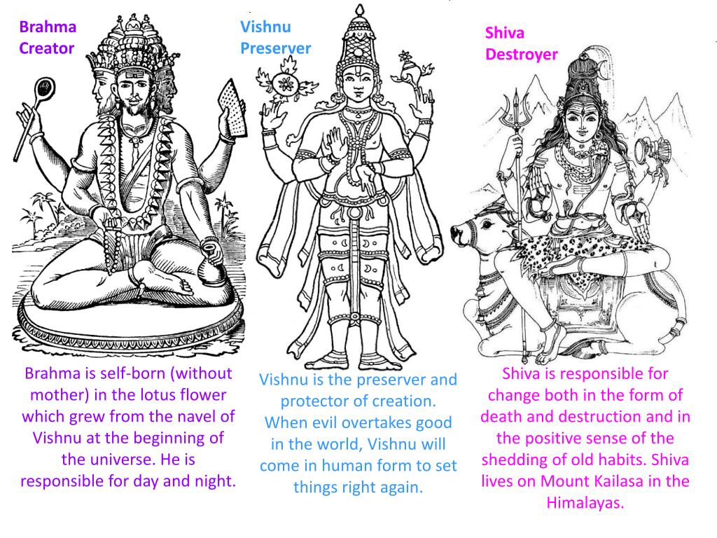 Brahma Creator Vishnu Preserver Shiva Destroyer Brahma is self-born (without mother) in the lotus flower which grew from the navel of Vishnu at the beginning of the universe. He is responsible for day and night. Shiva is responsible for change both in the form of death and destruction and in the positive sense of the shedding of old habits. Shiva lives on Mount Kailasa in the Himalayas. Vishnu is the preserver and protector of creation. When evil overtakes good in the world, Vishnu will come in human form to set things right again.