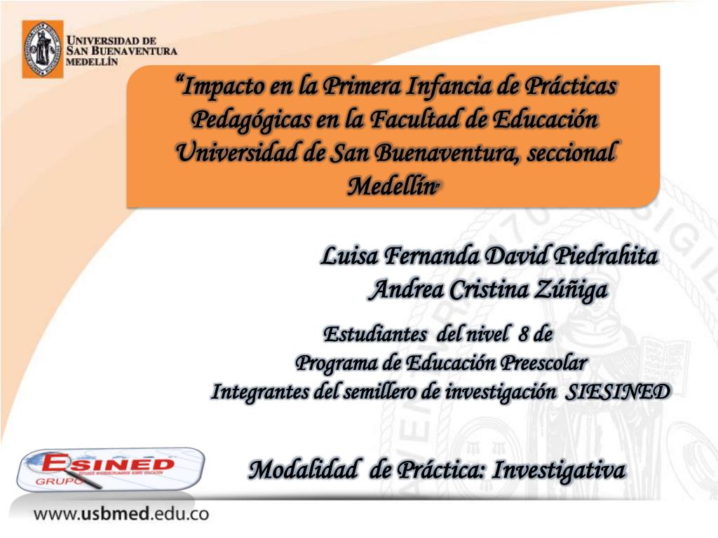 “Impacto en la Primera Infancia de Prácticas Pedagógicas en la Facultad de Educación Universidad de San Buenaventura, seccional Medellín” Luisa Fernanda David Piedrahita Andrea Cristina Zúñiga Estudiantes del nivel 8 de Programa de Educación Preescolar Integrantes del semillero de investigación SIESINED • Modalidad de Práctica: Investigativa