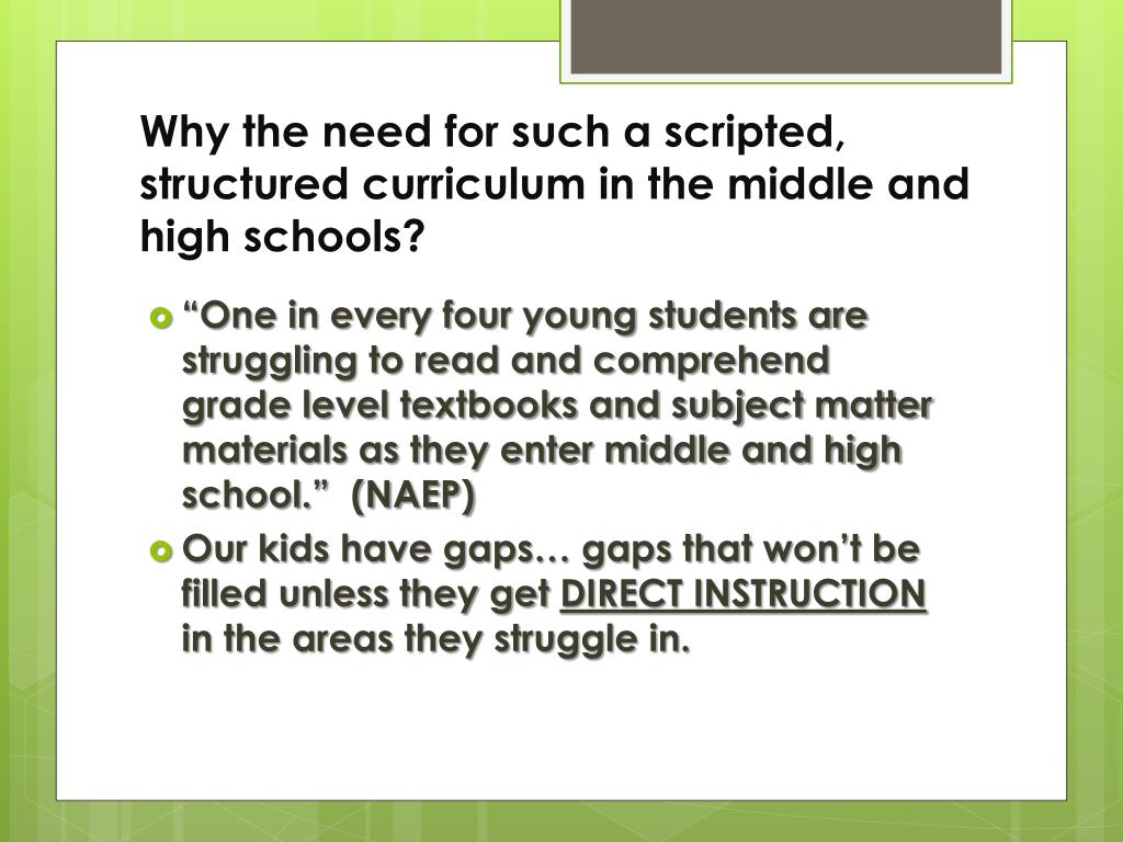 Why the need for such a scripted, structured curriculum in the middle and high schools? • “One in every four young students are struggling to read and comprehend grade level textbooks and subject matter materials as they enter middle and high school.” (NAEP) • Our kids have gaps… gaps that won’t be filled unless they get DIRECT INSTRUCTION in the areas they struggle in.