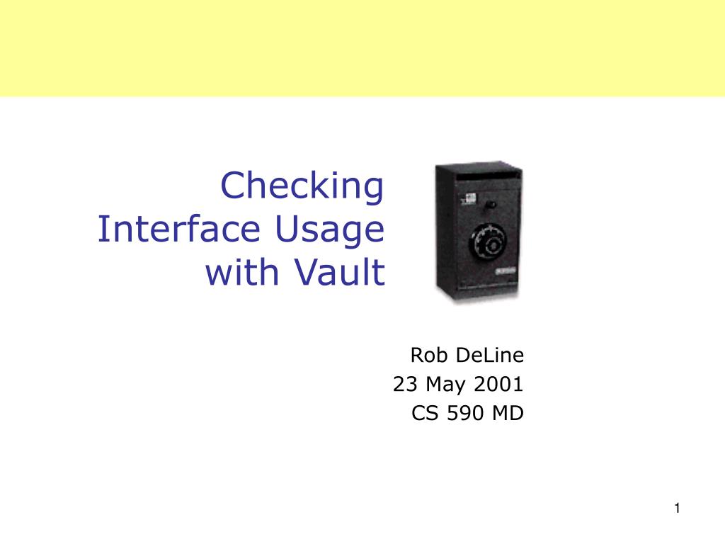 Checking Interface Usage with Vault. Rob DeLine 23 May 2001 CS 590 MD . Interfaces have (unenforced) usage rules. Usage rules are in the documentation — we hope! “Call A(x) before calling B(x)” “If you call A(x), you must eventually call B(x)” “Call A(x) before accessing variable y”