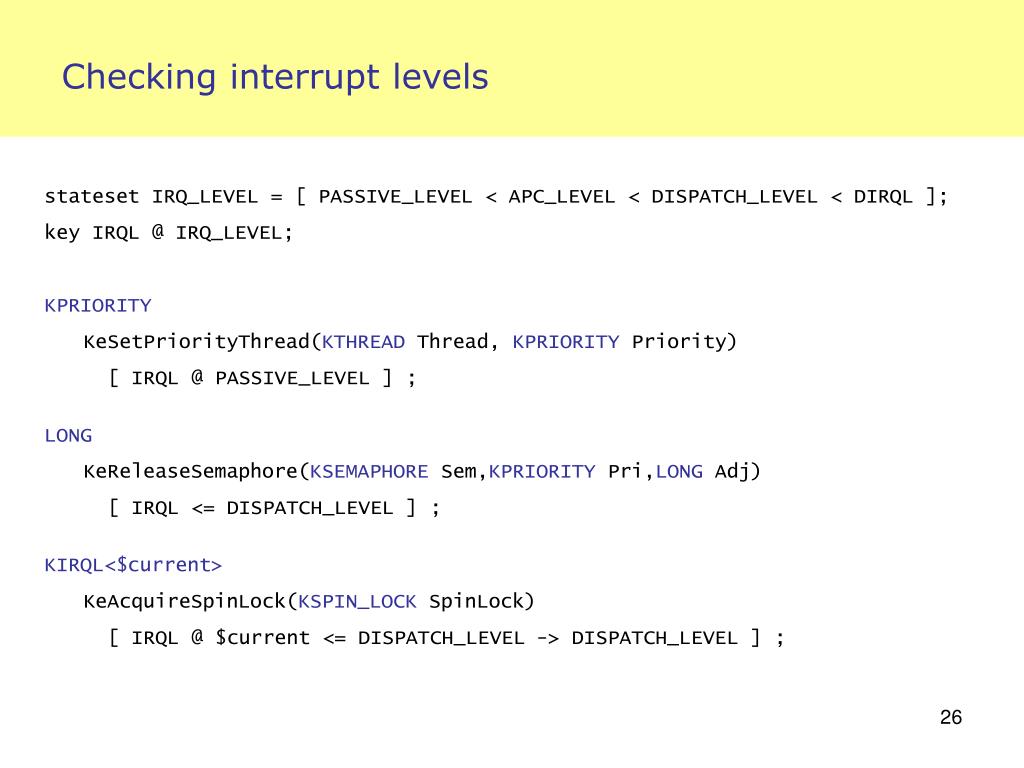Checking interrupt levels • stateset IRQ_LEVEL = [ PASSIVE_LEVEL < APC_LEVEL < DISPATCH_LEVEL < DIRQL ]; • key IRQL @ IRQ_LEVEL; • KPRIORITY • KeSetPriorityThread(KTHREAD Thread, KPRIORITY Priority) • [ IRQL @ PASSIVE_LEVEL ] ; • LONG • KeReleaseSemaphore(KSEMAPHORE Sem,KPRIORITY Pri,LONG Adj) • [ IRQL <= DISPATCH_LEVEL ] ; • KIRQL<$current> • KeAcquireSpinLock(KSPIN_LOCK SpinLock) • [ IRQL @ $current <= DISPATCH_LEVEL -> DISPATCH_LEVEL ] ;