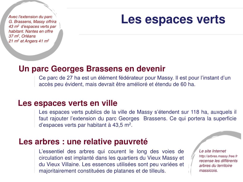 Les espaces verts Avec l’extension du parc G. Brassens, Massy offrira 43 m2 d’espaces verts par habitant. Nantes en offre 37 m2, Orléans 21 m2 et Angers 41 m2 Un parc Georges Brassens en devenir Ce parc de 27 ha est un élément fédérateur pour Massy. Il est pour l’instant d’un accès peu évident, mais devrait être amélioré et étendu de 60 ha. Les espaces verts en ville Les espaces verts publics de la ville de Massy s’étendent sur 118 ha, auxquels il faut rajouter l’extension du parc Georges Brassens. Ce qui portera la superficie d’espaces verts par habitant à 43,5 m2. Les arbres : une relative pauvreté L’essentiel des arbres qui courent le long des voies de circulation est implanté dans les quartiers du Vieux Massy et du Vieux Villaine. Les essences utilisées sont peu variées et majoritairement constituées de platanes et de tilleuls. Le site Internet http://arbres.massy.free.fr recense les différents arbres du territoire massicois.