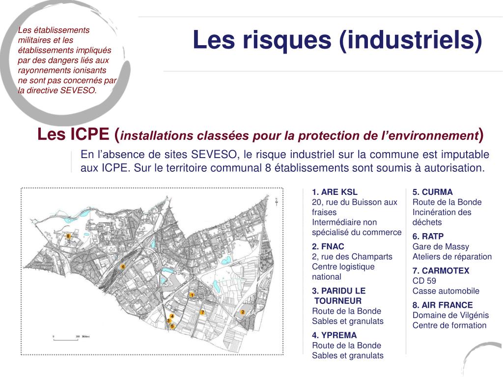 Les risques (industriels) Les établissements militaires et les établissements impliqués par des dangers liés aux rayonnements ionisants ne sont pas concernés par la directive SEVESO. Les ICPE (installations classées pour la protection de l’environnement) En l’absence de sites SEVESO, le risque industriel sur la commune est imputable aux ICPE. Sur le territoire communal 8 établissements sont soumis à autorisation. 1. ARE KSL 20, rue du Buisson aux fraises Intermédiaire non spécialisé du commerce 2. FNAC 2, rue des Champarts Centre logistique national 3. PARIDU LE TOURNEUR Route de la Bonde Sables et granulats 4. YPREMA Route de la Bonde Sables et granulats 5. CURMA Route de la Bonde Incinération des déchets 6. RATP Gare de Massy Ateliers de réparation 7. CARMOTEX CD 59 Casse automobile 8. AIR FRANCE Domaine de Vilgénis Centre de formation