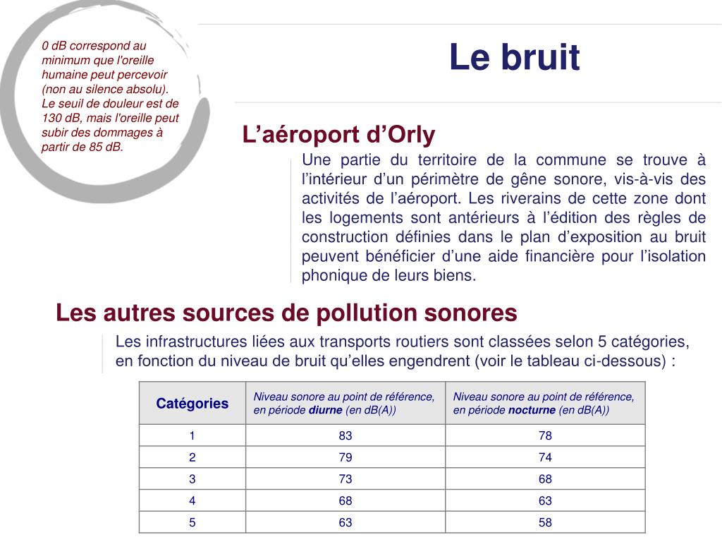 Le bruit 0 dB correspond au minimum que l'oreille humaine peut percevoir (non au silence absolu). Le seuil de douleur est de 130 dB, mais l'oreille peut subir des dommages à partir de 85 dB. L’aéroport d’Orly Une partie du territoire de la commune se trouve à l’intérieur d’un périmètre de gêne sonore, vis-à-vis des activités de l’aéroport. Les riverains de cette zone dont les logements sont antérieurs à l’édition des règles de construction définies dans le plan d’exposition au bruit peuvent bénéficier d’une aide financière pour l’isolation phonique de leurs biens. Les autres sources de pollution sonores Les infrastructures liées aux transports routiers sont classées selon 5 catégories, en fonction du niveau de bruit qu’elles engendrent (voir le tableau ci-dessous) :