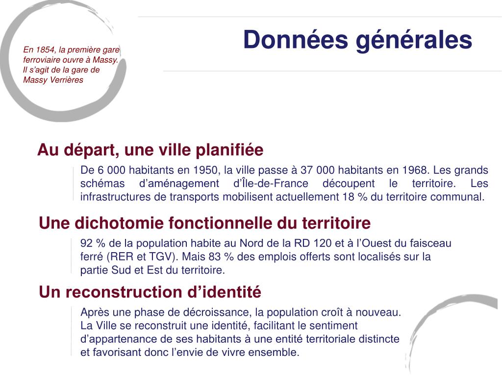 Données générales En 1854, la première gare ferroviaire ouvre à Massy. Il s’agit de la gare de Massy Verrières Au départ, une ville planifiée De 6 000 habitants en 1950, la ville passe à 37 000 habitants en 1968. Les grands schémas d’aménagement d’Île-de-France découpent le territoire. Les infrastructures de transports mobilisent actuellement 18 % du territoire communal. Une dichotomie fonctionnelle du territoire 92 % de la population habite au Nord de la RD 120 et à l’Ouest du faisceau ferré (RER et TGV). Mais 83 % des emplois offerts sont localisés sur la partie Sud et Est du territoire. Un reconstruction d’identité Après une phase de décroissance, la population croît à nouveau. La Ville se reconstruit une identité, facilitant le sentiment d’appartenance de ses habitants à une entité territoriale distincte et favorisant donc l’envie de vivre ensemble.