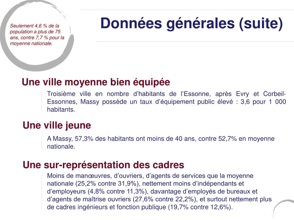 Données générales (suite) Seulement 4,6 % de la population a plus de 75 ans, contre 7,7 % pour la moyenne nationale. Une ville moyenne bien équipée Troisième ville en nombre d’habitants de l’Essonne, après Evry et Corbeil-Essonnes, Massy possède un taux d’équipement public élevé : 3,6 pour 1 000 habitants. Une ville jeune A Massy, 57,3% des habitants ont moins de 40 ans, contre 52,7% en moyenne nationale. Une sur-représentation des cadres Moins de manœuvres, d’ouvriers, d’agents de services que la moyenne nationale (25,2% contre 31,9%), nettement moins d’indépendants et d’employeurs (4,8% contre 11,3%), davantage d’employés de bureaux et d’agents de maîtrise ouvriers (27,6% contre 22,2%), et surtout nettement plus de cadres ingénieurs et fonction publique (19,7% contre 12,6%).