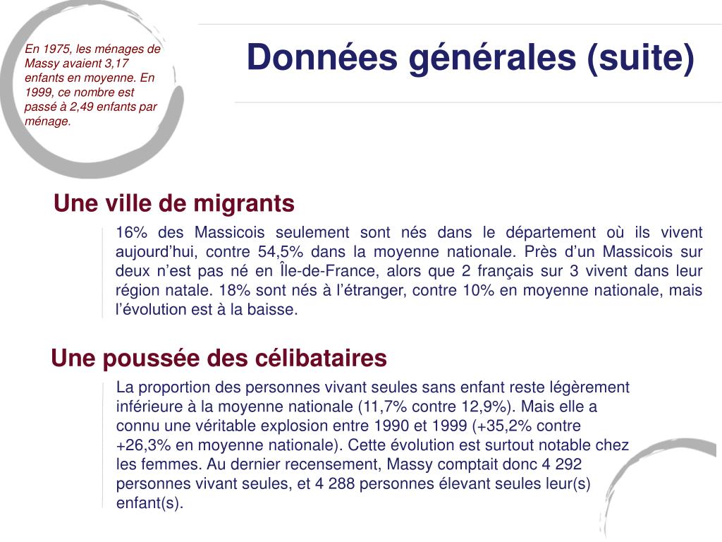 Données générales (suite) En 1975, les ménages de Massy avaient 3,17 enfants en moyenne. En 1999, ce nombre est passé à 2,49 enfants par ménage. Une ville de migrants 16% des Massicois seulement sont nés dans le département où ils vivent aujourd’hui, contre 54,5% dans la moyenne nationale. Près d’un Massicois sur deux n’est pas né en Île-de-France, alors que 2 français sur 3 vivent dans leur région natale. 18% sont nés à l’étranger, contre 10% en moyenne nationale, mais l’évolution est à la baisse. Une poussée des célibataires La proportion des personnes vivant seules sans enfant reste légèrement inférieure à la moyenne nationale (11,7% contre 12,9%). Mais elle a connu une véritable explosion entre 1990 et 1999 (+35,2% contre +26,3% en moyenne nationale). Cette évolution est surtout notable chez les femmes. Au dernier recensement, Massy comptait donc 4 292 personnes vivant seules, et 4 288 personnes élevant seules leur(s) enfant(s).