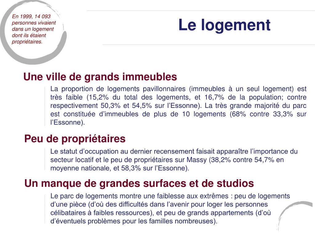 En 1999, 14 093 personnes vivaient dans un logement dont ils étaient propriétaires. Le logement Une ville de grands immeubles La proportion de logements pavillonnaires (immeubles à un seul logement) est très faible (15,2% du total des logements, et 16,7% de la population; contre respectivement 50,3% et 54,5% sur l’Essonne). La très grande majorité du parc est constituée d’immeubles de plus de 10 logements (68% contre 33,3% sur l’Essonne). Peu de propriétaires Le statut d’occupation au dernier recensement faisait apparaître l’importance du secteur locatif et le peu de propriétaires sur Massy (38,2% contre 54,7% en moyenne nationale, et 58,3% sur l’Essonne). Un manque de grandes surfaces et de studios Le parc de logements montre une faiblesse aux extrêmes : peu de logements d’une pièce (d’où des difficultés dans l’avenir pour loger les personnes célibataires à faibles ressources), et peu de grands appartements (d’où d’éventuels problèmes pour les familles nombreuses).