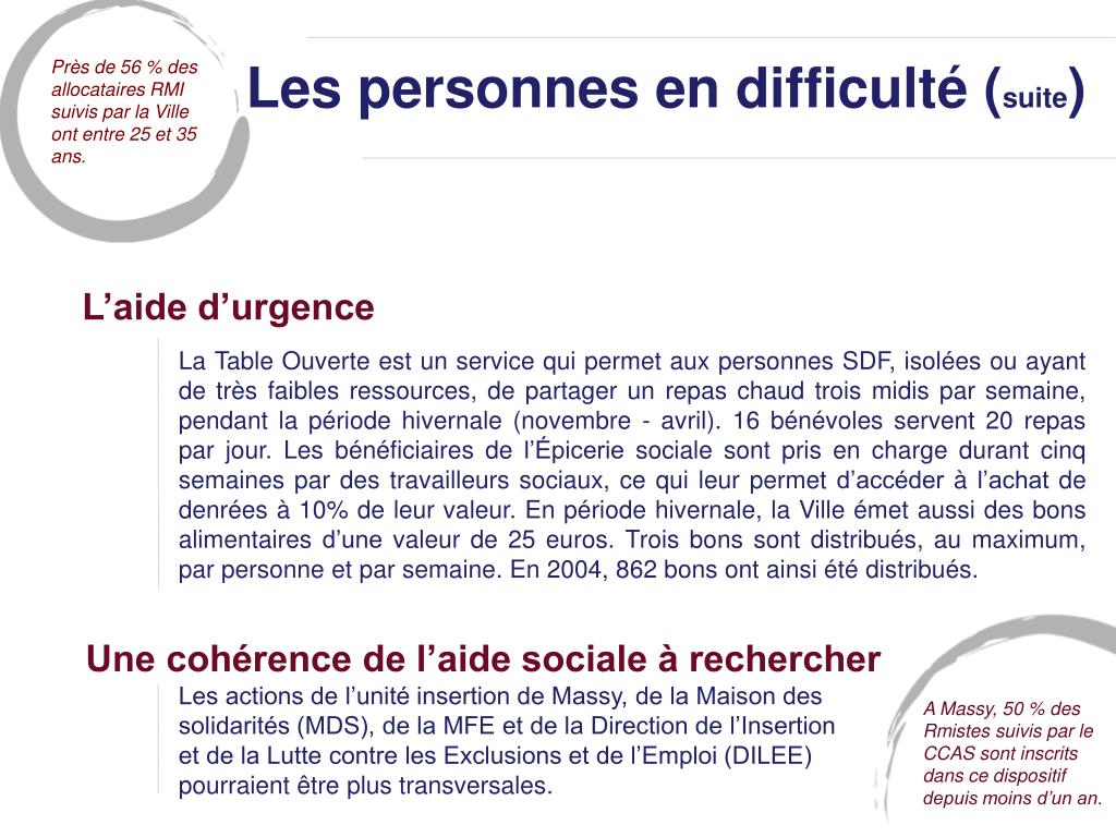Les personnes en difficulté (suite) Près de 56 % des allocataires RMI suivis par la Ville ont entre 25 et 35 ans. L’aide d’urgence La Table Ouverte est un service qui permet aux personnes SDF, isolées ou ayant de très faibles ressources, de partager un repas chaud trois midis par semaine, pendant la période hivernale (novembre - avril). 16 bénévoles servent 20 repas par jour. Les bénéficiaires de l’Épicerie sociale sont pris en charge durant cinq semaines par des travailleurs sociaux, ce qui leur permet d’accéder à l’achat de denrées à 10% de leur valeur. En période hivernale, la Ville émet aussi des bons alimentaires d’une valeur de 25 euros. Trois bons sont distribués, au maximum, par personne et par semaine. En 2004, 862 bons ont ainsi été distribués. Une cohérence de l’aide sociale à rechercher Les actions de l’unité insertion de Massy, de la Maison des solidarités (MDS), de la MFE et de la Direction de l’Insertion et de la Lutte contre les Exclusions et de l’Emploi (DILEE) pourraient être plus transversales. A Massy, 50 % des Rmistes suivis par le CCAS sont inscrits dans ce dispositif depuis moins d’un an.