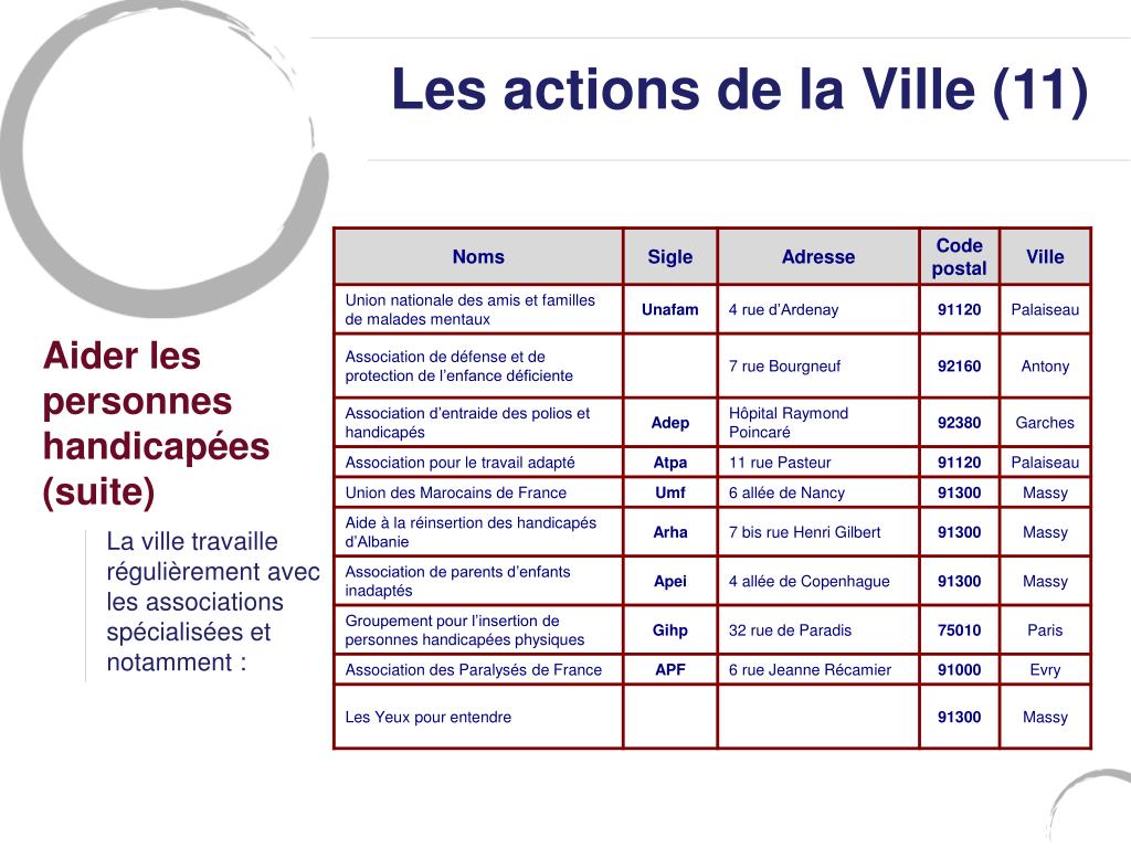 Les actions de la Ville (11) Aider les personnes handicapées (suite) La ville travaille régulièrement avec les associations spécialisées et notamment :