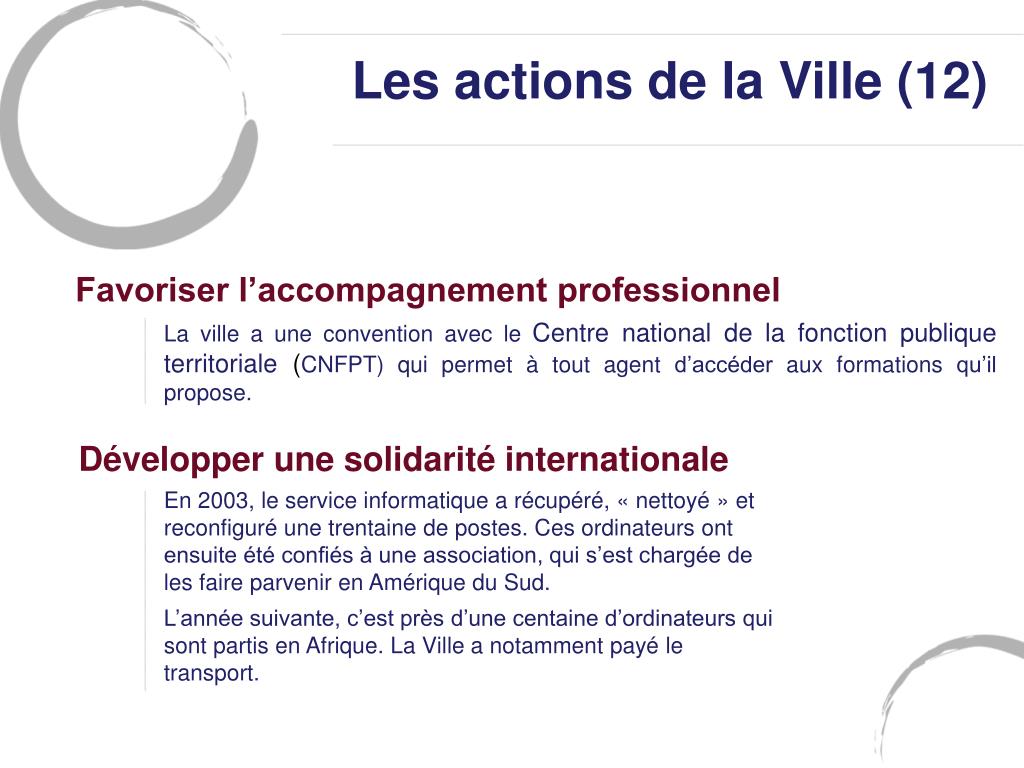 Les actions de la Ville (12) Favoriser l’accompagnement professionnel La ville a une convention avec le Centre national de la fonction publique territoriale (CNFPT) qui permet à tout agent d’accéder aux formations qu’il propose. Développer une solidarité internationale En 2003, le service informatique a récupéré, « nettoyé » et reconfiguré une trentaine de postes. Ces ordinateurs ont ensuite été confiés à une association, qui s’est chargée de les faire parvenir en Amérique du Sud. L’année suivante, c’est près d’une centaine d’ordinateurs qui sont partis en Afrique. La Ville a notamment payé le transport.