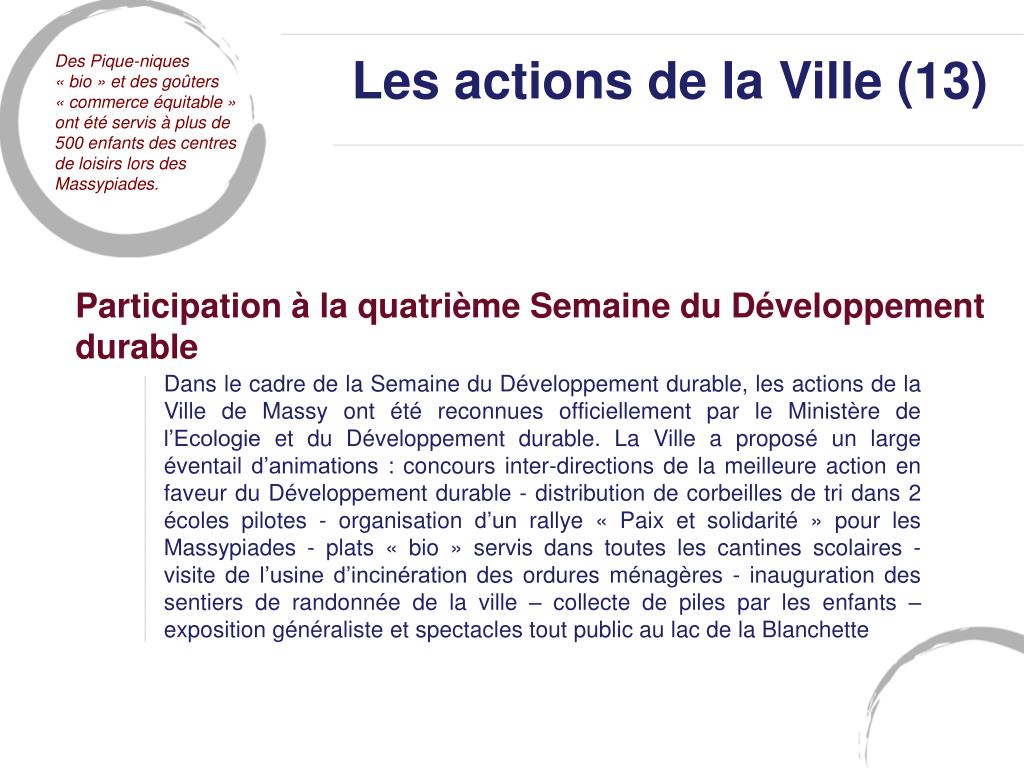 Les actions de la Ville (13) Des Pique-niques« bio » et des goûters« commerce équitable » ont été servis à plus de 500 enfants des centres de loisirs lors des Massypiades. Participation à la quatrième Semaine du Développement durable Dans le cadre de la Semaine du Développement durable, les actions de la Ville de Massy ont été reconnues officiellement par le Ministère de l’Ecologie et du Développement durable. La Ville a proposé un large éventail d’animations : concours inter-directions de la meilleure action en faveur du Développement durable - distribution de corbeilles de tri dans 2 écoles pilotes - organisation d’un rallye « Paix et solidarité » pour les Massypiades - plats « bio » servis dans toutes les cantines scolaires - visite de l’usine d’incinération des ordures ménagères - inauguration des sentiers de randonnée de la ville – collecte de piles par les enfants – exposition généraliste et spectacles tout public au lac de la Blanchette
