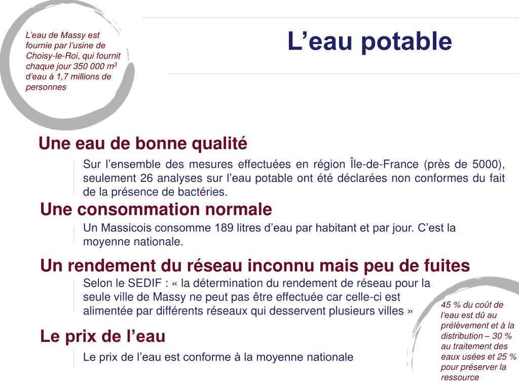 L’eau potable L’eau de Massy est fournie par l’usine de Choisy-le-Roi, qui fournit chaque jour 350 000 m3 d’eau à 1,7 millions de personnes Une eau de bonne qualité Sur l’ensemble des mesures effectuées en région Île-de-France (près de 5000), seulement 26 analyses sur l’eau potable ont été déclarées non conformes du fait de la présence de bactéries. Une consommation normale Un Massicois consomme 189 litres d’eau par habitant et par jour. C’est la moyenne nationale. Un rendement du réseau inconnu mais peu de fuites Selon le SEDIF : « la détermination du rendement de réseau pour la seule ville de Massy ne peut pas être effectuée car celle-ci est alimentée par différents réseaux qui desservent plusieurs villes » 45 % du coût de l’eau est dû au prélèvement et à la distribution – 30 % au traitement des eaux usées et 25 % pour préserver la ressource Le prix de l’eau Le prix de l’eau est conforme à la moyenne nationale