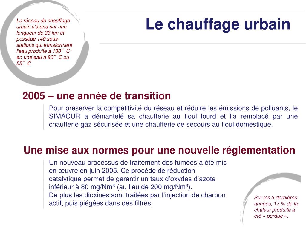Le chauffage urbain Le réseau de chauffage urbain s’étend sur une longueur de 33 km et possède 140 sous-stations qui transforment l'eau produite à 180°C en une eau à 80°C ou 55°C 2005 – une année de transition Pour préserver la compétitivité du réseau et réduire les émissions de polluants, le SIMACUR a démantelé sa chaufferie au fioul lourd et l’a remplacé par une chaufferie gaz sécurisée et une chaufferie de secours au fioul domestique. Une mise aux normes pour une nouvelle réglementation Un nouveau processus de traitement des fumées a été mis en œuvre en juin 2005. Ce procédé de réduction catalytique permet de garantir un taux d’oxydes d’azote inférieur à 80 mg/Nm3 (au lieu de 200 mg/Nm3). De plus les dioxines sont traitées par l’injection de charbon actif, puis piégées dans des filtres. Sur les 3 dernières années, 17 % de la chaleur produite a été « perdue ».