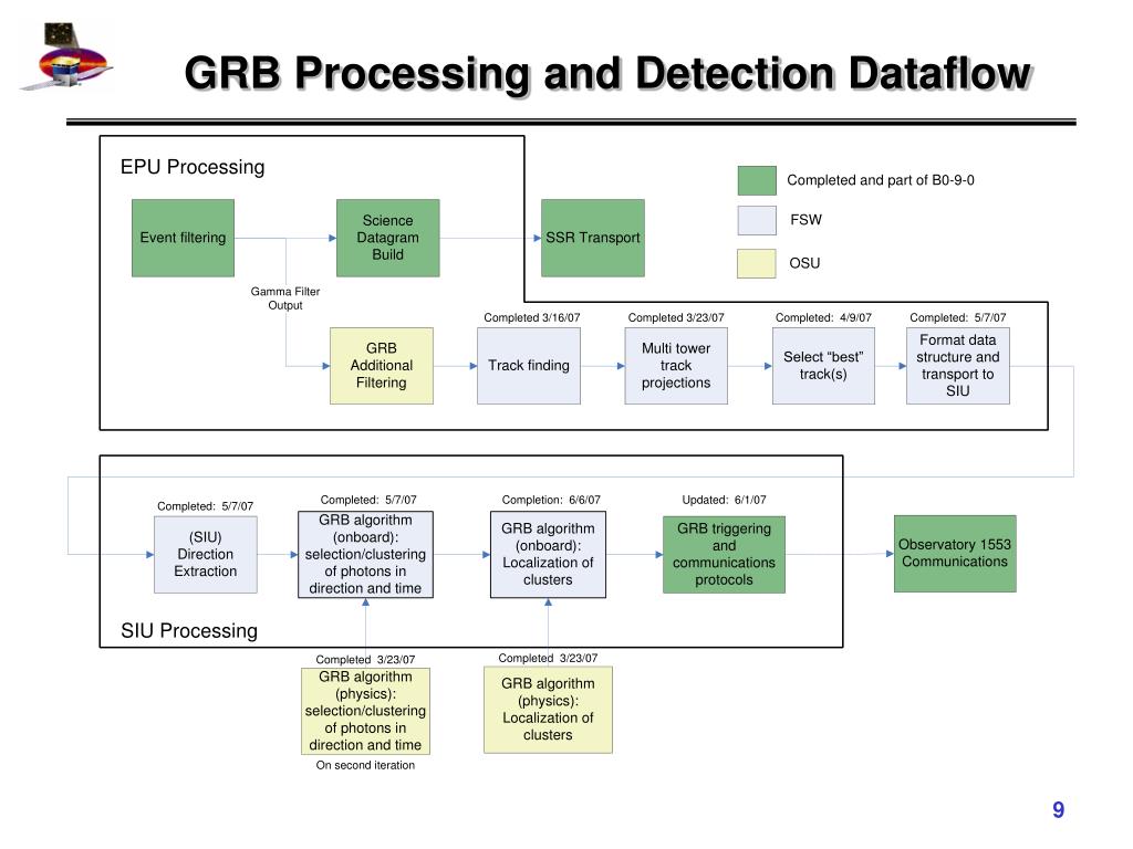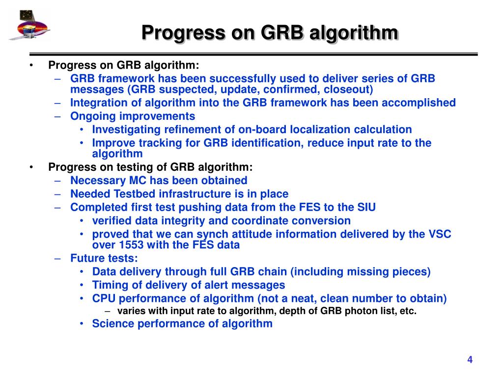 Progress on GRB algorithm • Progress on GRB algorithm: • GRB framework has been successfully used to deliver series of GRB messages (GRB suspected, update, confirmed, closeout) • Integration of algorithm into the GRB framework has been accomplished • Ongoing improvements • Investigating refinement of on-board localization calculation • Improve tracking for GRB identification, reduce input rate to the algorithm • Progress on testing of GRB algorithm: • Necessary MC has been obtained • Needed Testbed infrastructure is in place • Completed first test pushing data from the FES to the SIU • verified data integrity and coordinate conversion • proved that we can synch attitude information delivered by the VSC over 1553 with the FES data • Future tests: • Data delivery through full GRB chain (including missing pieces) • Timing of delivery of alert messages • CPU performance of algorithm (not a neat, clean number to obtain) • varies with input rate to algorithm, depth of GRB photon list, etc. • Science performance of algorithm