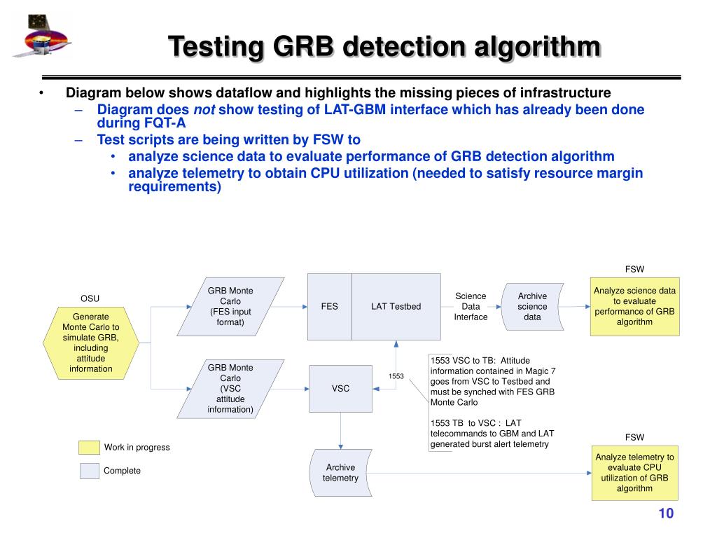 Testing GRB detection algorithm • Diagram below shows dataflow and highlights the missing pieces of infrastructure • Diagram does not show testing of LAT-GBM interface which has already been done during FQT-A • Test scripts are being written by FSW to • analyze science data to evaluate performance of GRB detection algorithm • analyze telemetry to obtain CPU utilization (needed to satisfy resource margin requirements)