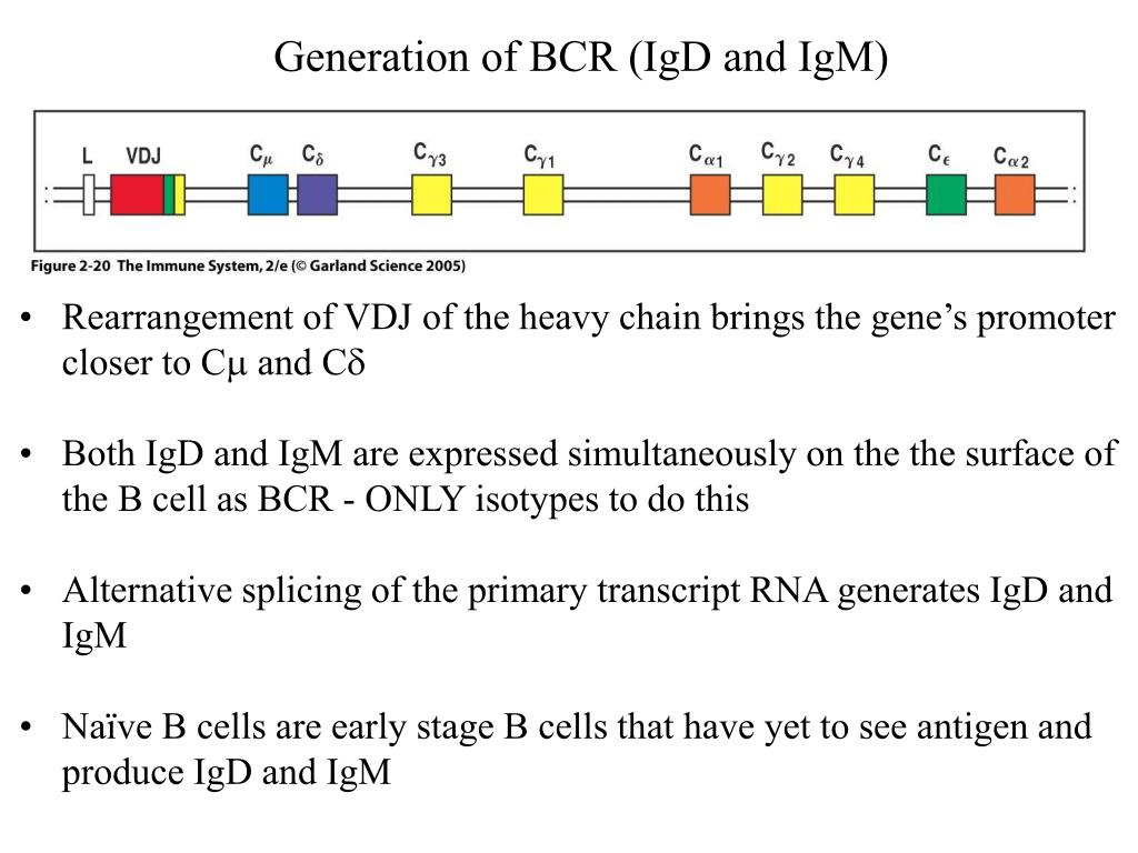 Generation of BCR (IgD and IgM) • Rearrangement of VDJ of the heavy chain brings the gene’s promoter closer to C and C • Both IgD and IgM are expressed simultaneously on the the surface of the B cell as BCR - ONLY isotypes to do this • Alternative splicing of the primary transcript RNA generates IgD and IgM • Naïve B cells are early stage B cells that have yet to see antigen and produce IgD and IgM