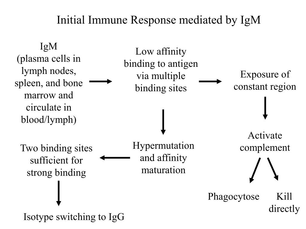 Initial Immune Response mediated by IgM IgM (plasma cells in lymph nodes, spleen, and bone marrow and circulate in blood/lymph) Low affinity binding to antigen via multiple binding sites Exposure of constant region Activate complement Hypermutation and affinity maturation Two binding sites sufficient for strong binding Phagocytose Kill directly Isotype switching to IgG