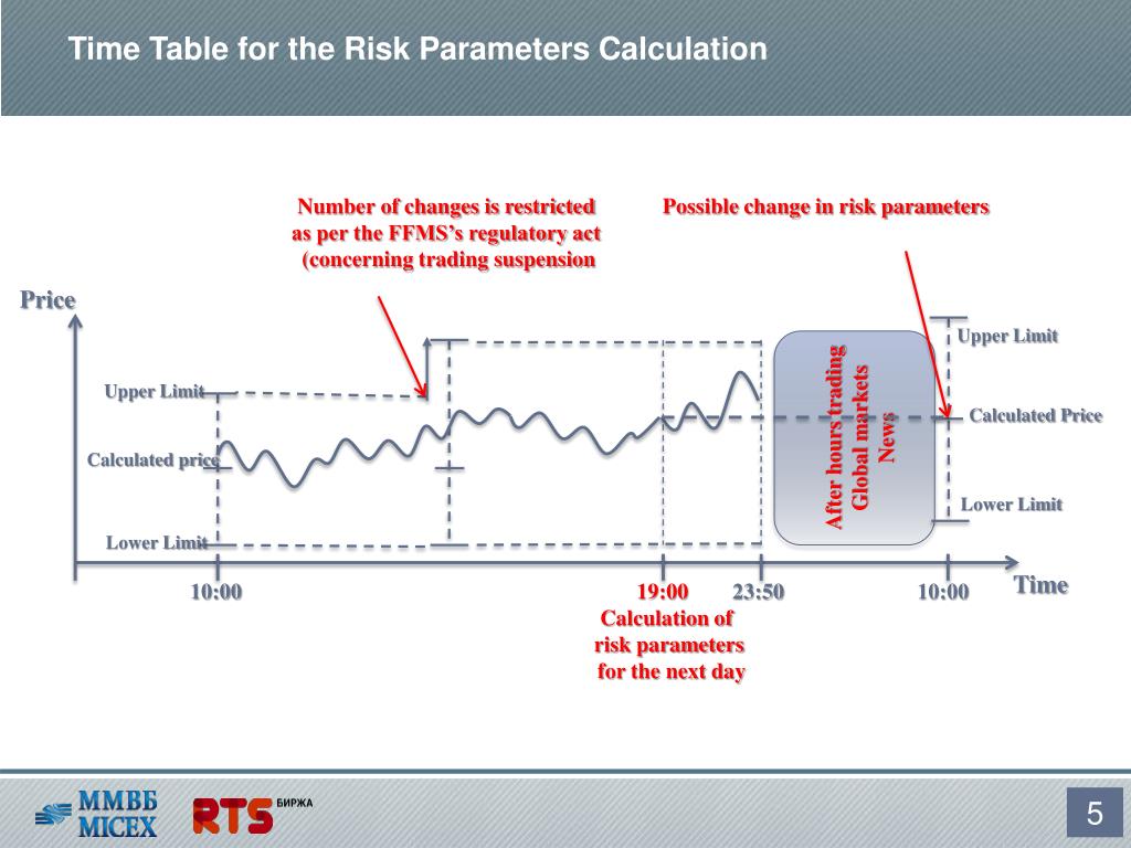 Risk parameters Repo trade price Term • Risk parameters: • the calculated price (of shares and bonds that involved into trades with partial collateral): • for shares– closing price on the spot market; • for bonds– the comparative method(static Z-spread). • the calculated repo rate (the weighted average repo rate or the Repo rate indicator). • Market risk rate and interest risk rate (method of adaptive rates with predefined level for confidence probability and estimation horizon). • Upper and Lower limits of the Assessment range for market and interest rate risks (using the relevant Risk Rates). One day Calculated repo rate risk Lower Limit Security price Upper Limit Calculated price 4